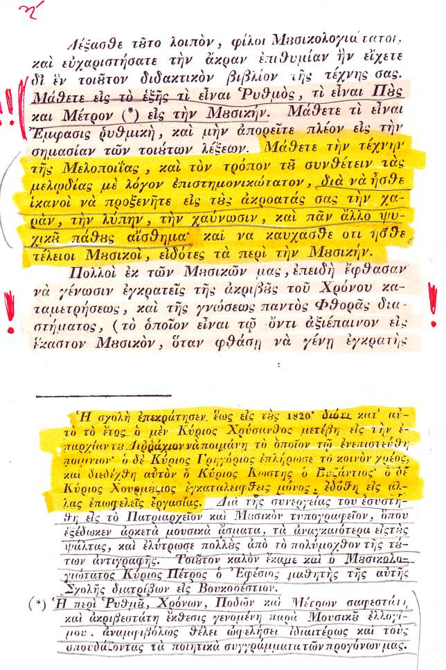 Ἱεροψαλτῶν), Ἔτσι λοιπὸν ἀπὸ τοὺς λόγους αὐτοὺς τοῦ Μαθητοῦ τοῦ Χρυσάνθου καὶ μάλιστα καὶ ἐκδότου τοῦ Μεγάλου Θεωρητικοῦ του, βγάζουμε σαφέστατα τὰ ἐξῆς συμπεράσματα: α. Τέλειος Ψάλτης ἦταν αὐτὸς ποὺ γινόταν ἐγκρατῆς τῆς «ἀκριβοῦς τοῦ Χρόνου Καταμετρήσεως», καὶ τῆς «γνώσεως παντὸς Φθορᾶς διαστήματος». Οὔτε ἀναφορὰ κὰν σὲ ρυθμοὺς καὶ τὰ συναφῆ. β. Λέει ὁ Πελοπίδας στοὺς Ἱεροψάλτες ὅτι μὲ αὐτὸ τὸ Μέγα Θεωρητικὸ θὰ μάθουν [ἐπιτέλους!] τὶ εἶναι Ῥυθμός καὶ τὰ συναφή. Δηλαδὴ τοὺς Ἱεροψάλτες τότε (καὶ ἀπ' ἀνέκαθεν) δὲν τοὺς ἔννοιαζαν οἱ ῥυθμοὶ κτλ. τὰ ὁποῖα ἐνδιαφέρουν τοὺς τραγουδιστές, διότι δὲν χρησιμοποιούνταν τὸ «κατὰ ρυθμὸν ψάλσιμο» στὴν ἐκκλησία, γιὰ αὐτὸ καὶ εἶχαν ἄγνοια καὶ «ἀποροῦσαν (sic) εἰς τὴν σημασίαν τῶν λέξεων αὐτῶν». γ. Λέει στοὺς Ἱεροψάλτες ὅτι μὲ αὐτὸ τὸ Μέγα Θεωρητικὸ θὰ μάθουν [ἐπιτέλους!] τὶ εἶναι Ἔμφασις ῥυθμική. Καὶ πάλι τοὺς Ἱεροψάλτες δὲν τοὺς ἐνδιέφερε ἡ «ῥυθμικὴ ἔμφασις», διότι δὲν χρησιμοποιούνταν τὸ «κατὰ ρυθμὸν ψάλσιμο» στὴν ἐκκλησία, γιὰ αὐτὸ καὶ εἶχαν ἄγνοια, καὶ «ἀποροῦσαν (sic) εἰς τὴν σημασίαν τῶν λέξεων αὐτῶν» κατὰ τὸν Πελοπίδα.