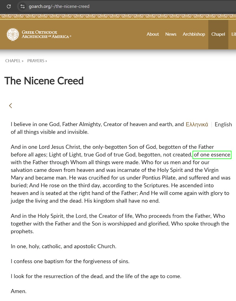 Ἡ Ἑλληνική Ὀρθόδοξη Ἀρχιεπισκοπή στήν Ἀμερική χρησιμοποιεῖ τό "of one essence" (ἐλέγχθηκε 10/12/2025).