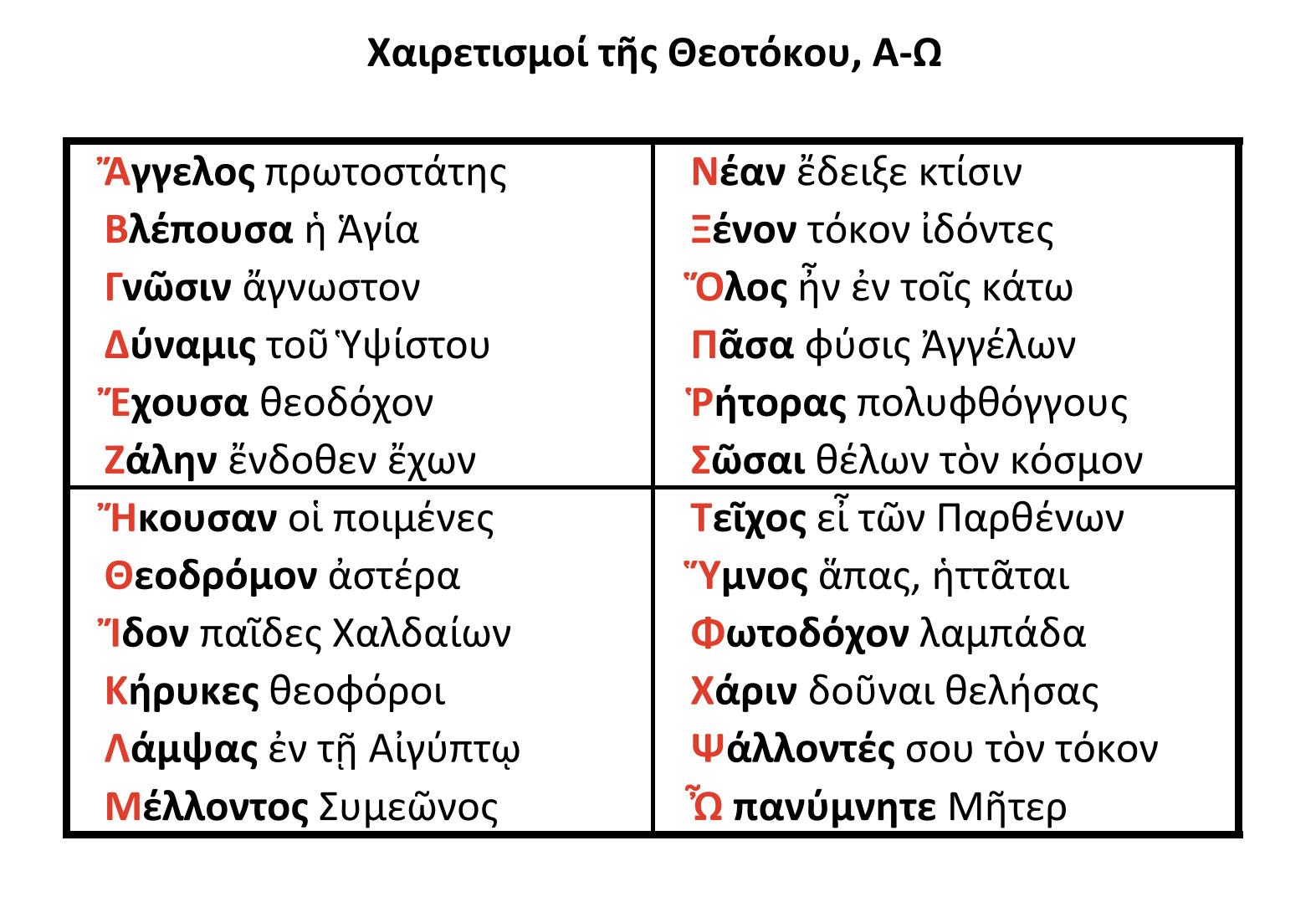 Χαιρετισμοί τῆς Παναγίας, Α-Ω